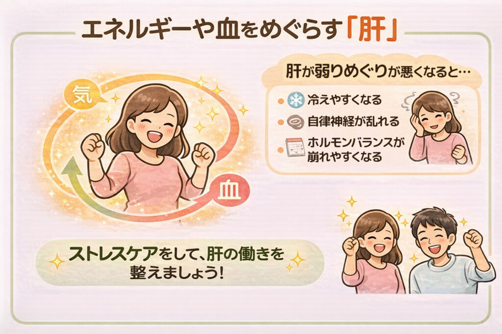 ストレスや不安が続くと、肝の働きが悪くなり、エネルギーが全身をめぐりにくくなります。エネルギーがめぐりにくくなると、血もめぐりにくくなります。