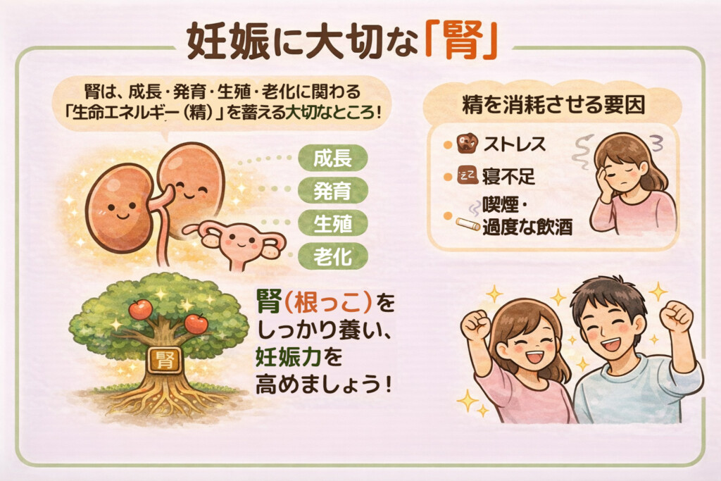 そのため、腎をしっかり養い、精を無駄に消耗させないことが、妊娠力を高める大切なポイントになります。