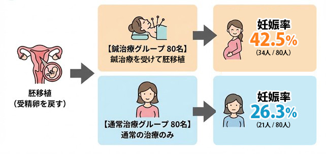この研究では、鍼治療を受けた上で生殖補助医療(ART)に臨んだ女性80名中34人が臨床妊娠を記録したとのことです(妊娠率42.5%)。